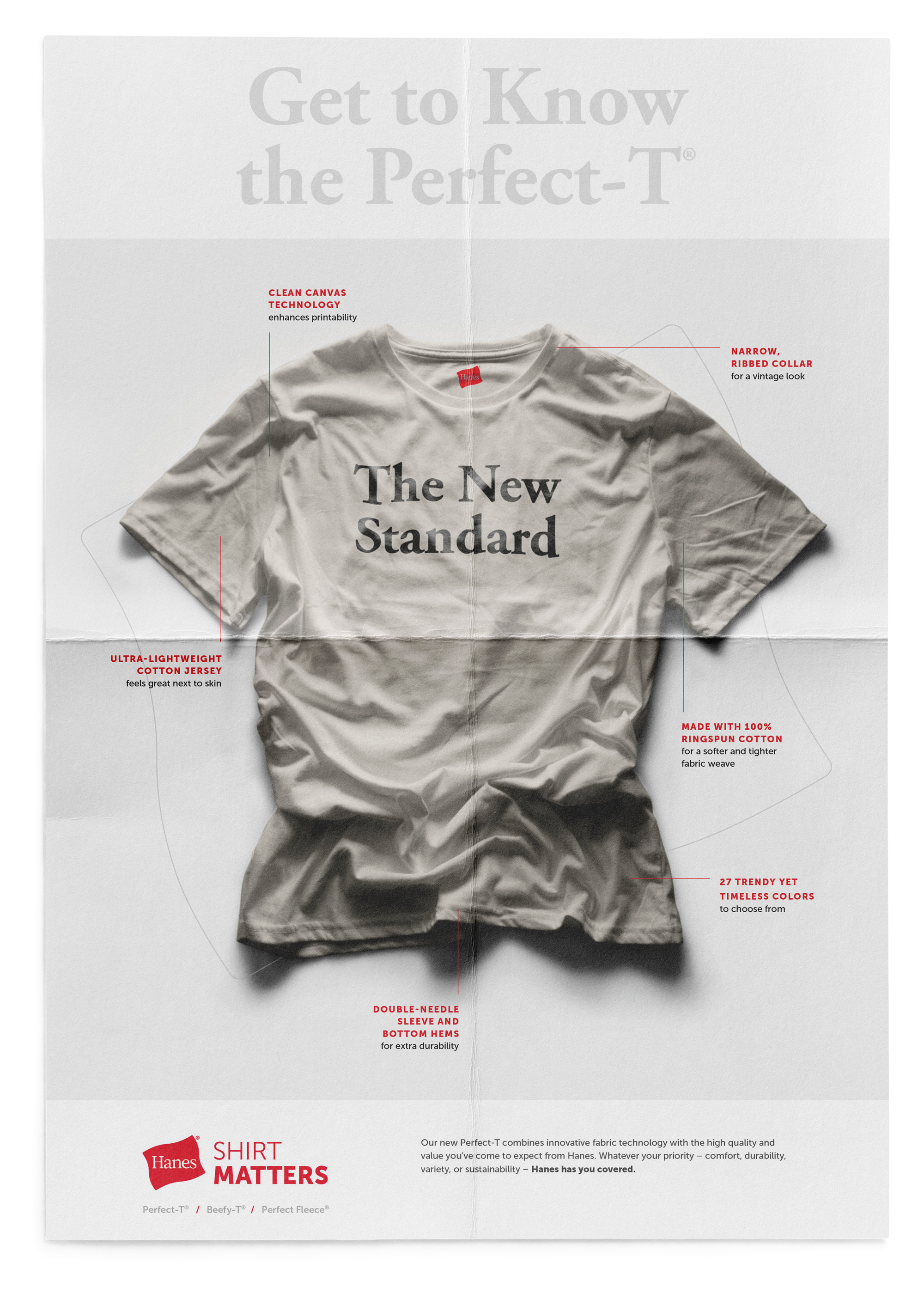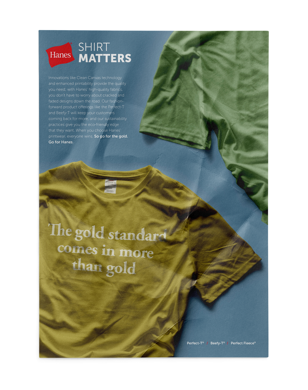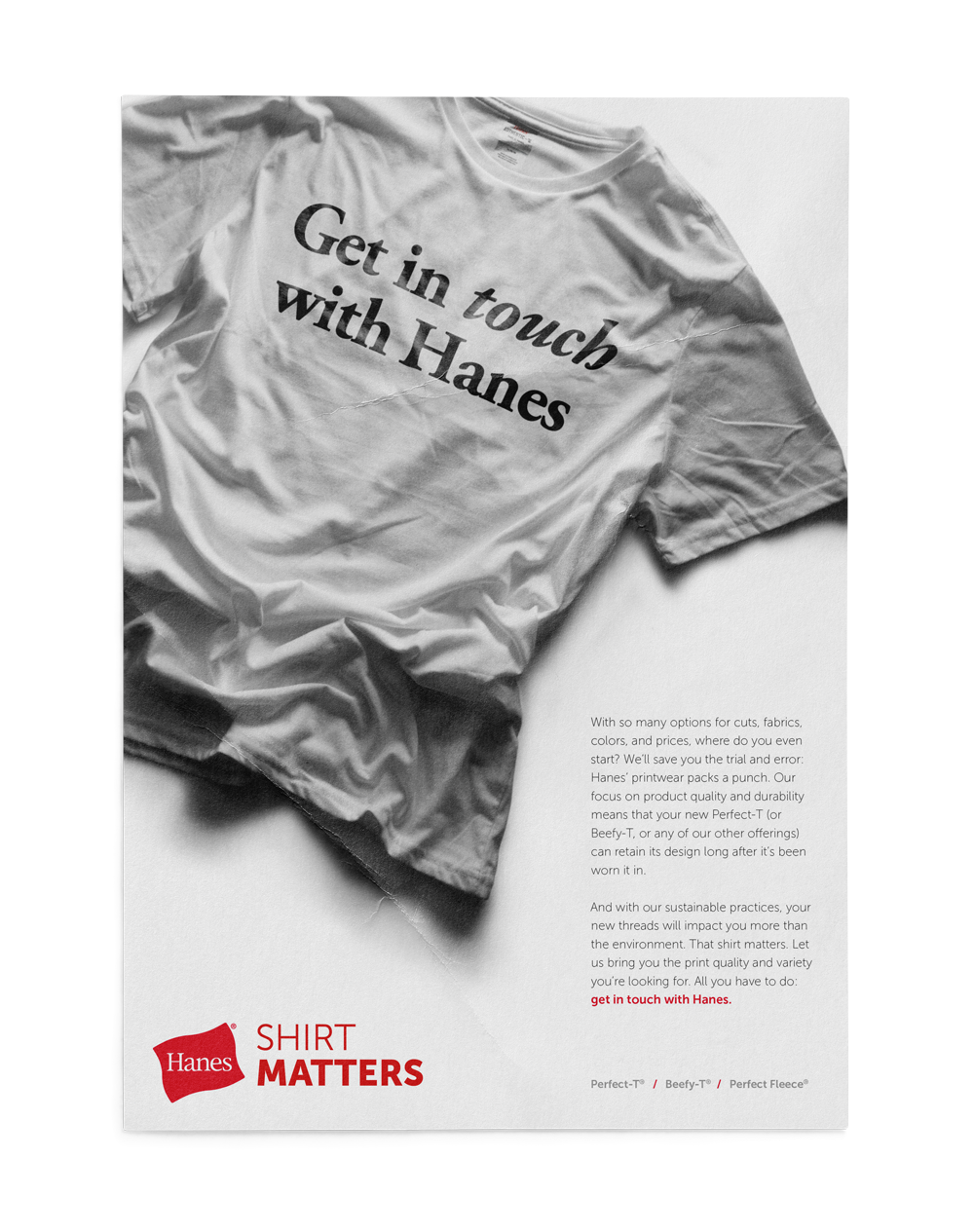Hanes came to Plan B Advertising for an ad campaign that would help market their products more towards printers as well as wholesalers that distribute to printers. My team and I developed “Shirt Matters” as a classic concept that pushes the versatility, durability, and printability of a Hanes product. The simple approach to this look and feel is inspired by minimalistic vintage ads that let the message sing while also allowing for visual impact. This concept consisted of a wordmark lockup, adlob examples, digital ads and deliverables for potential samples that might be sent to the printers or wholesalers.