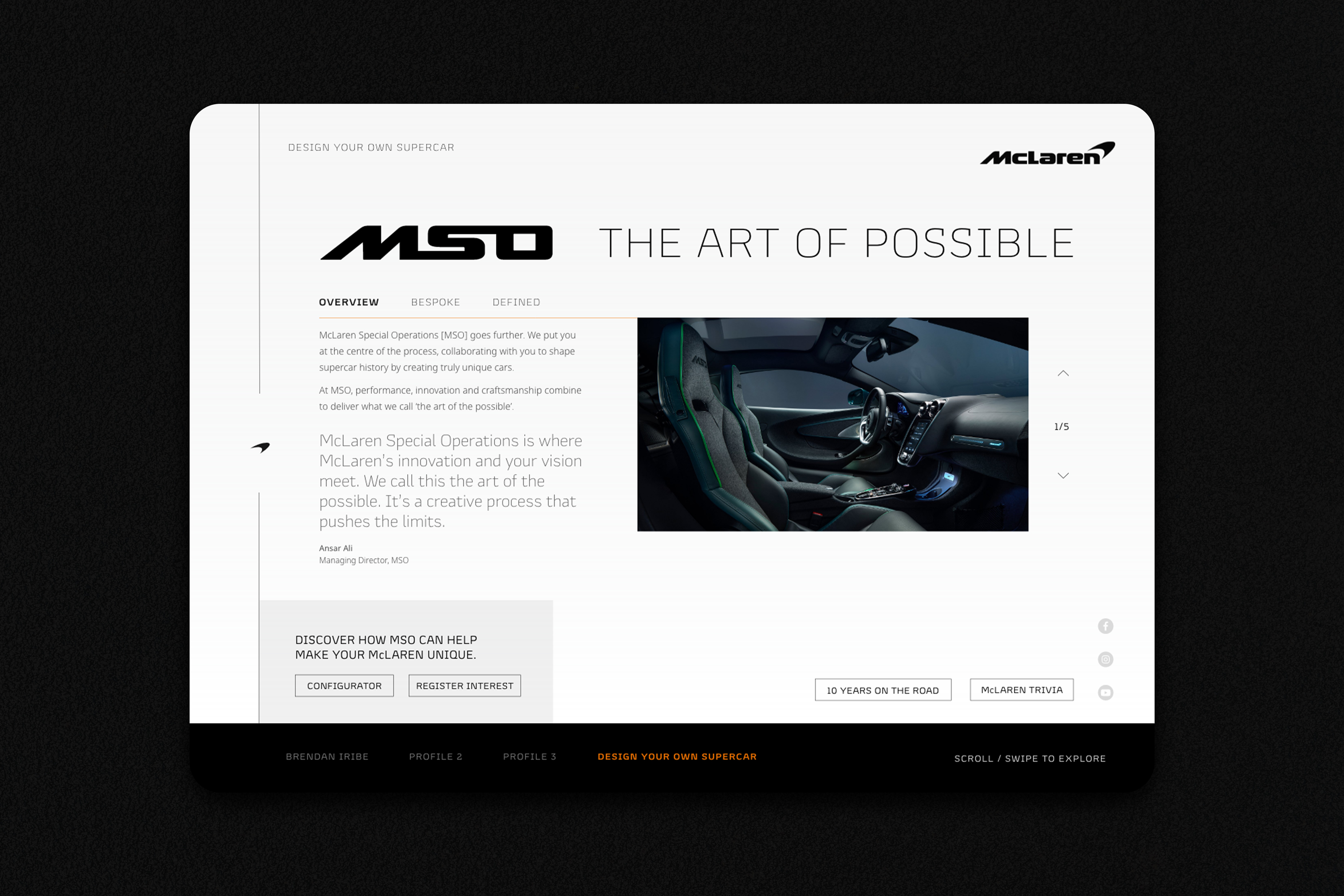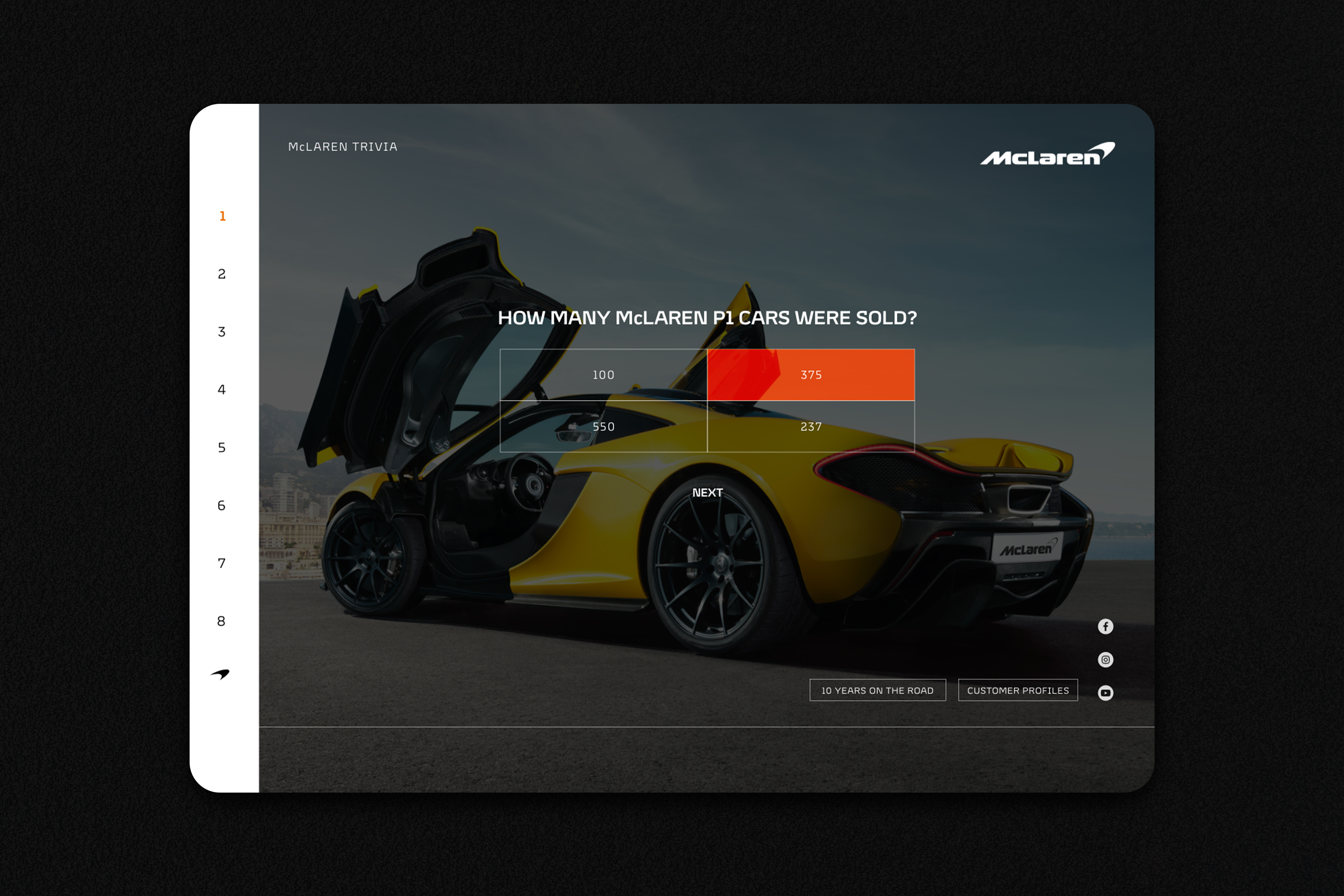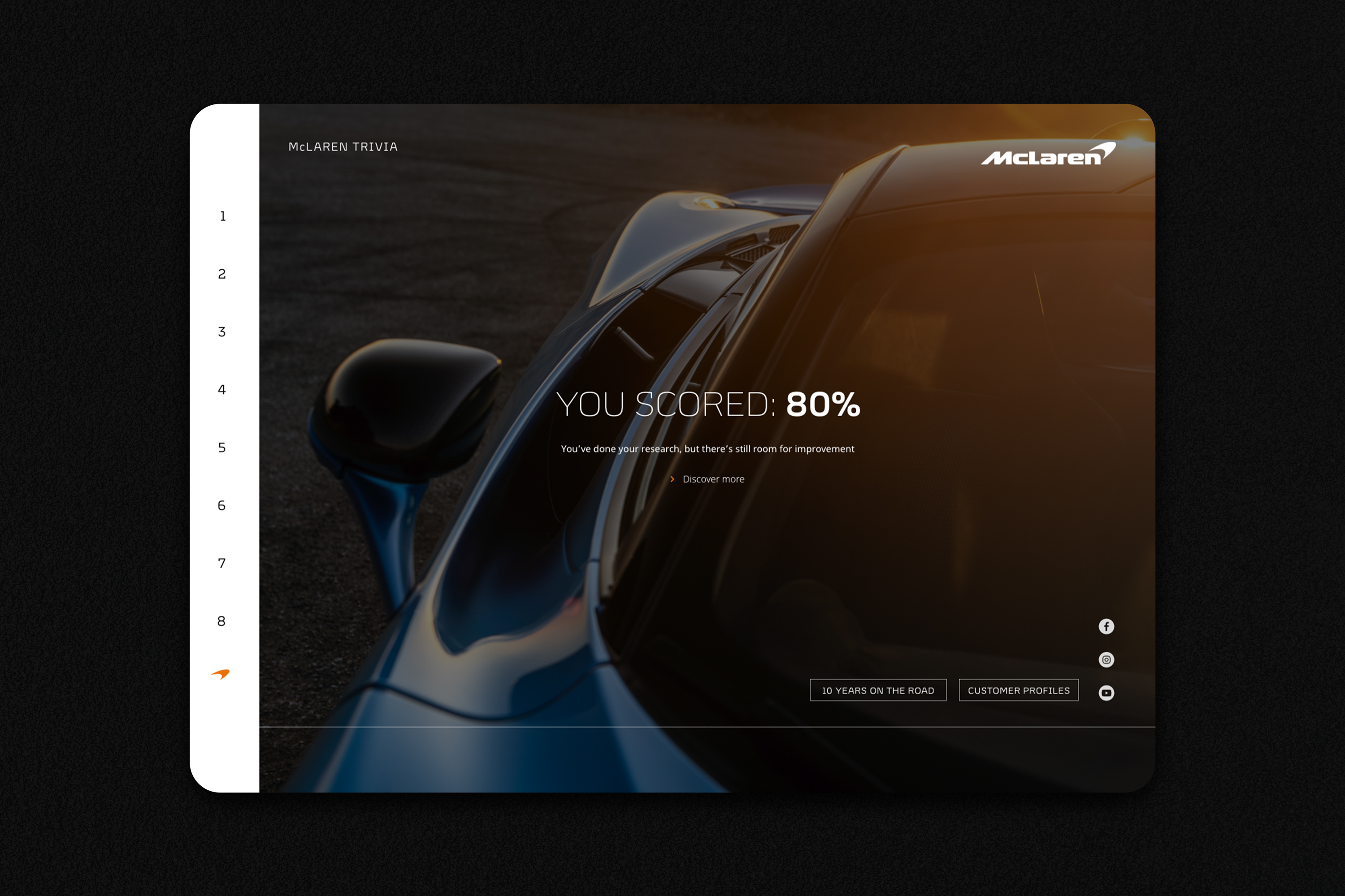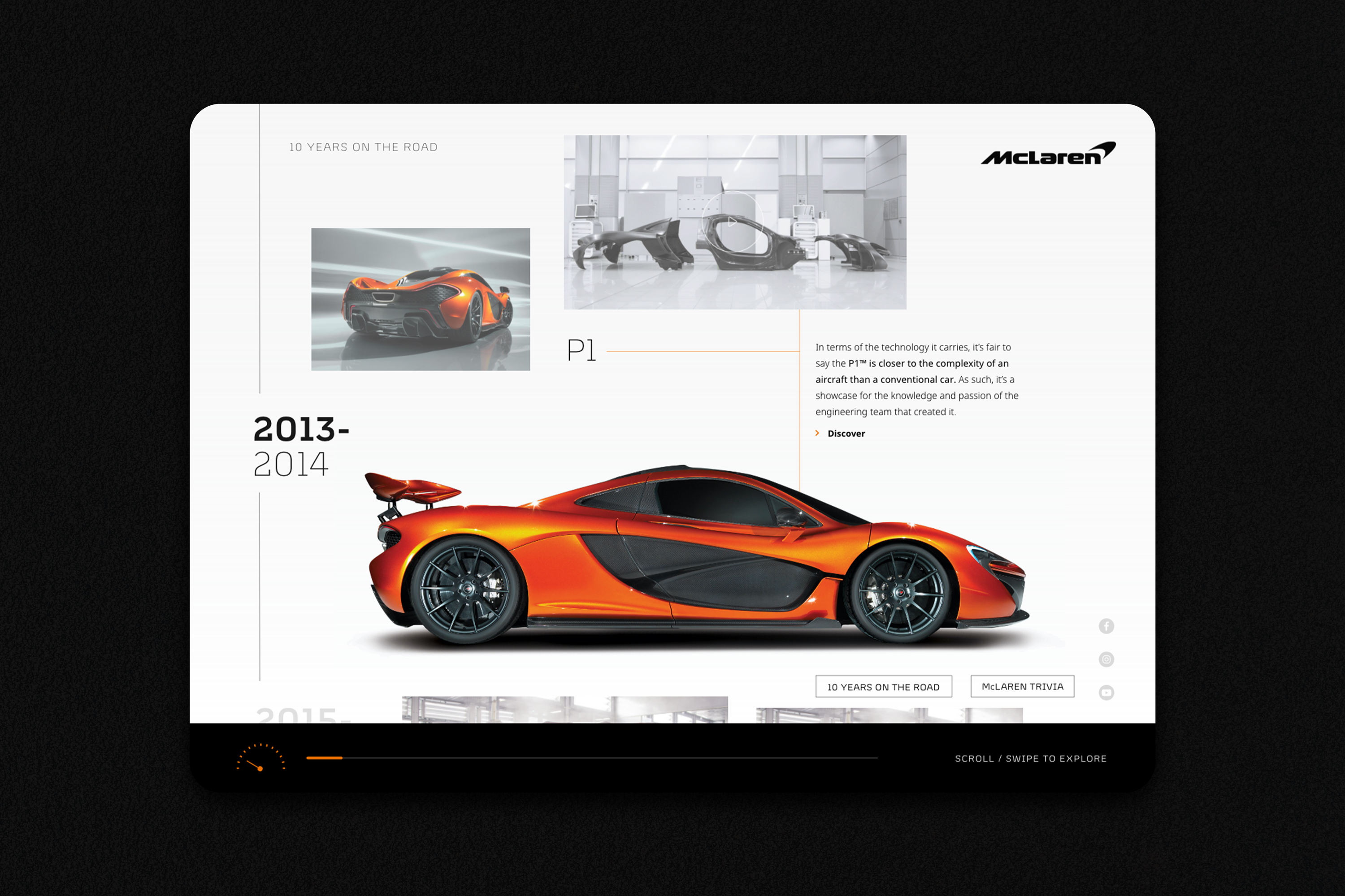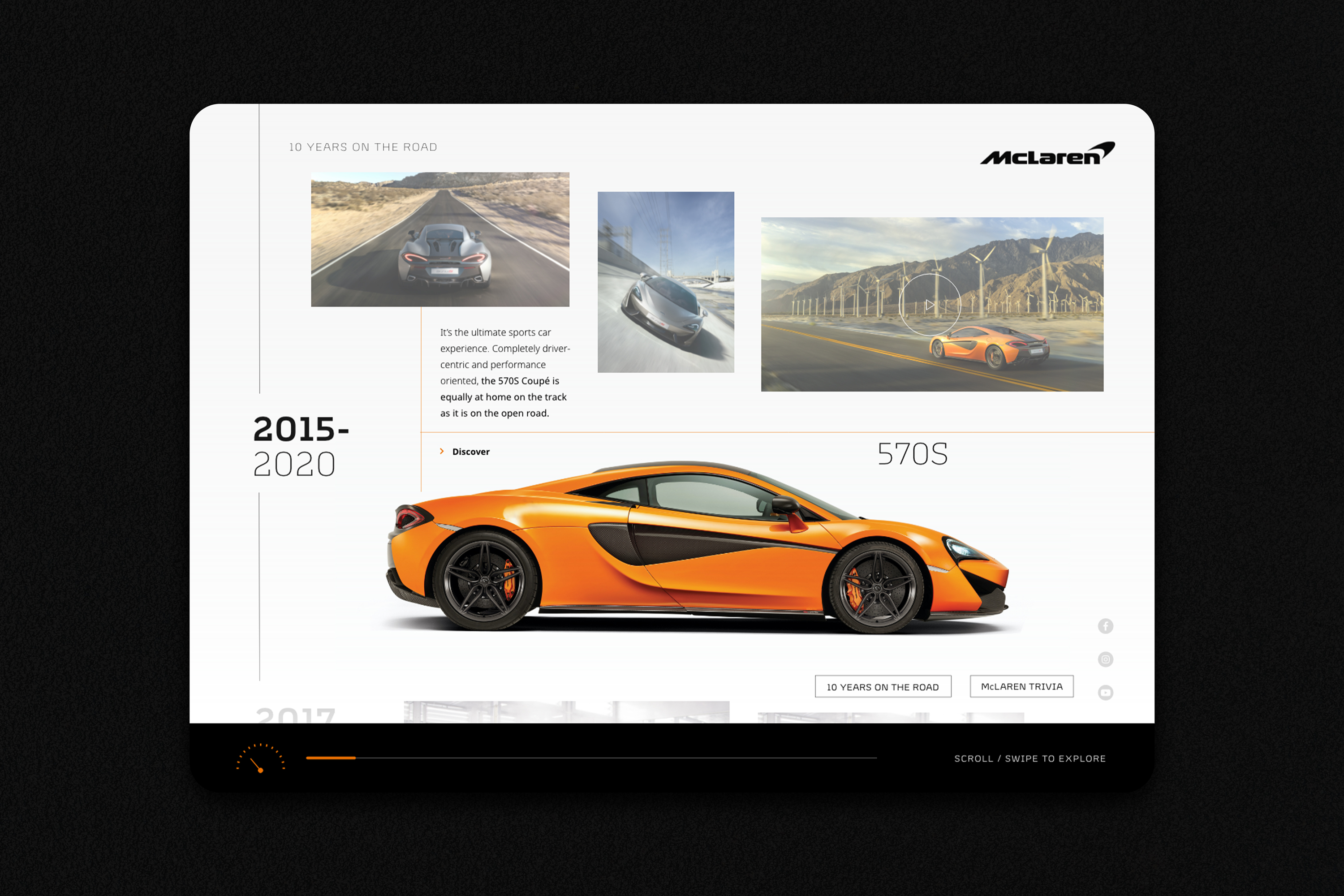 At the beginning of the 2021, Plan B Advertising was tasked with concepting some ideas for McLaren’s 10 year anniversary of producing road cars. My concept for a microsite was pushed to the client with the intention of it being a fun interactive experience that would also educate users on the McLaren’s road car history. I designed this microsite to have easy navigation, game play, product information that links to the global site, driver profiles and a detailed interactive timeline of the vehicles.