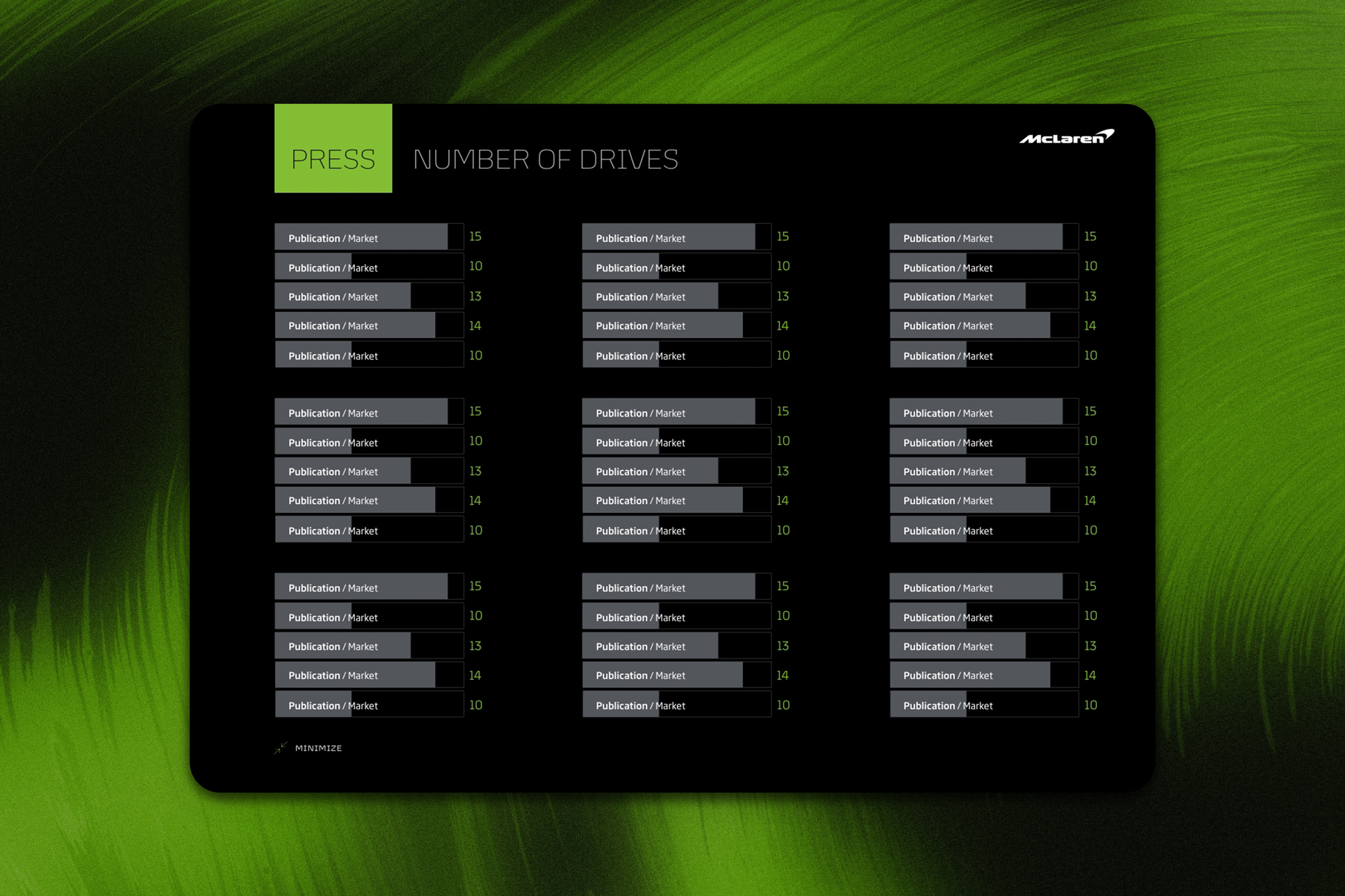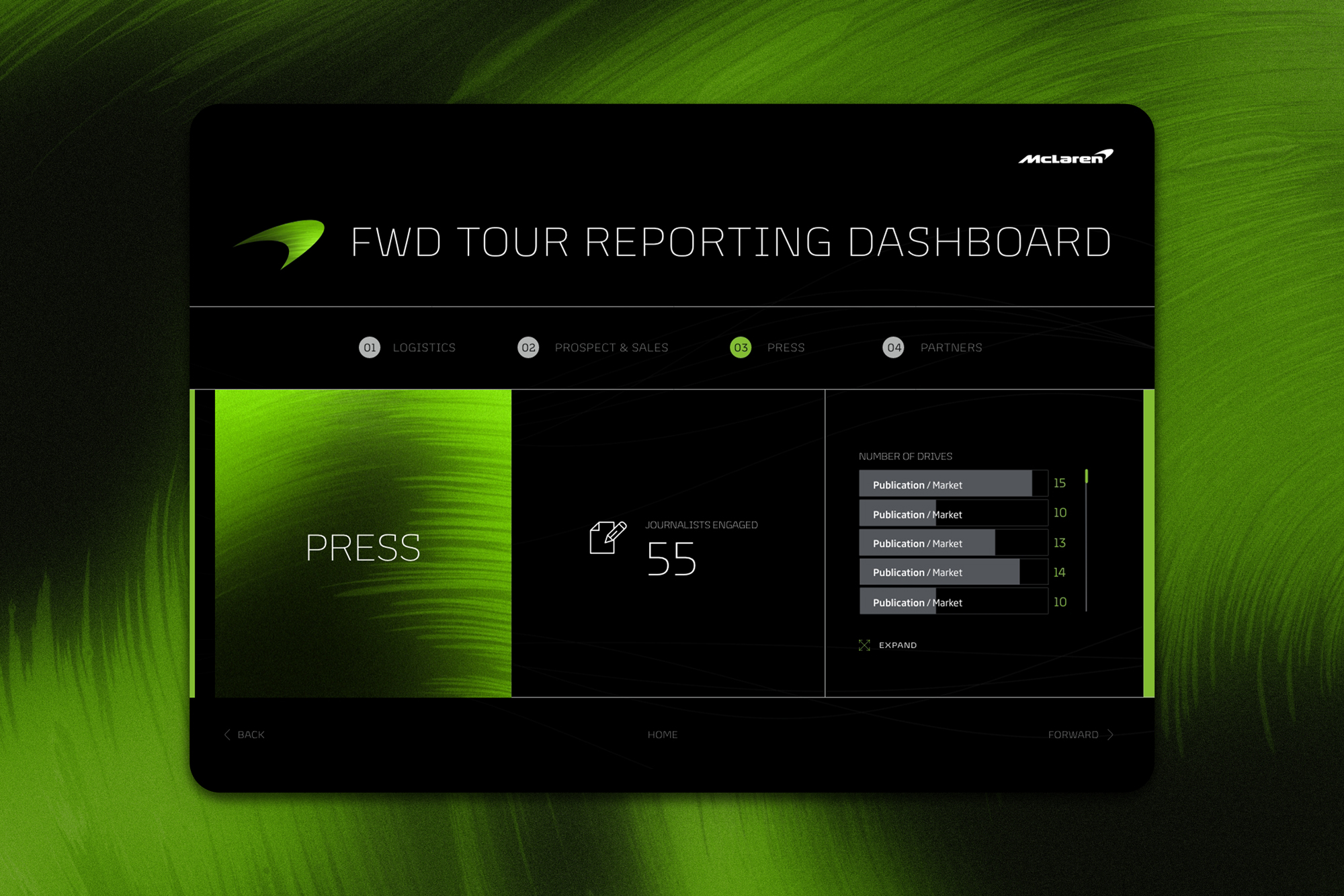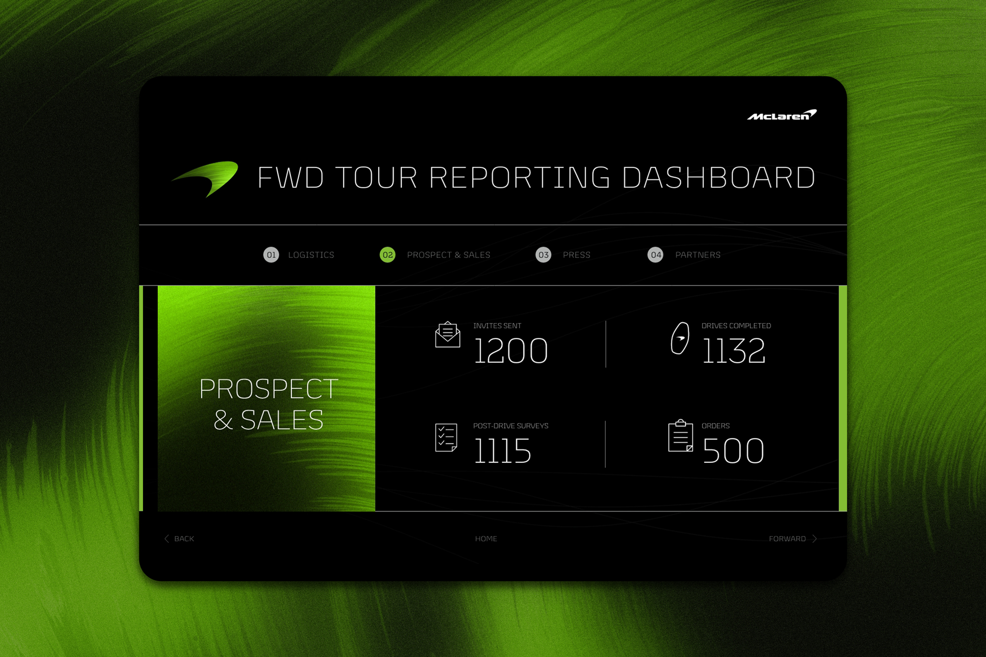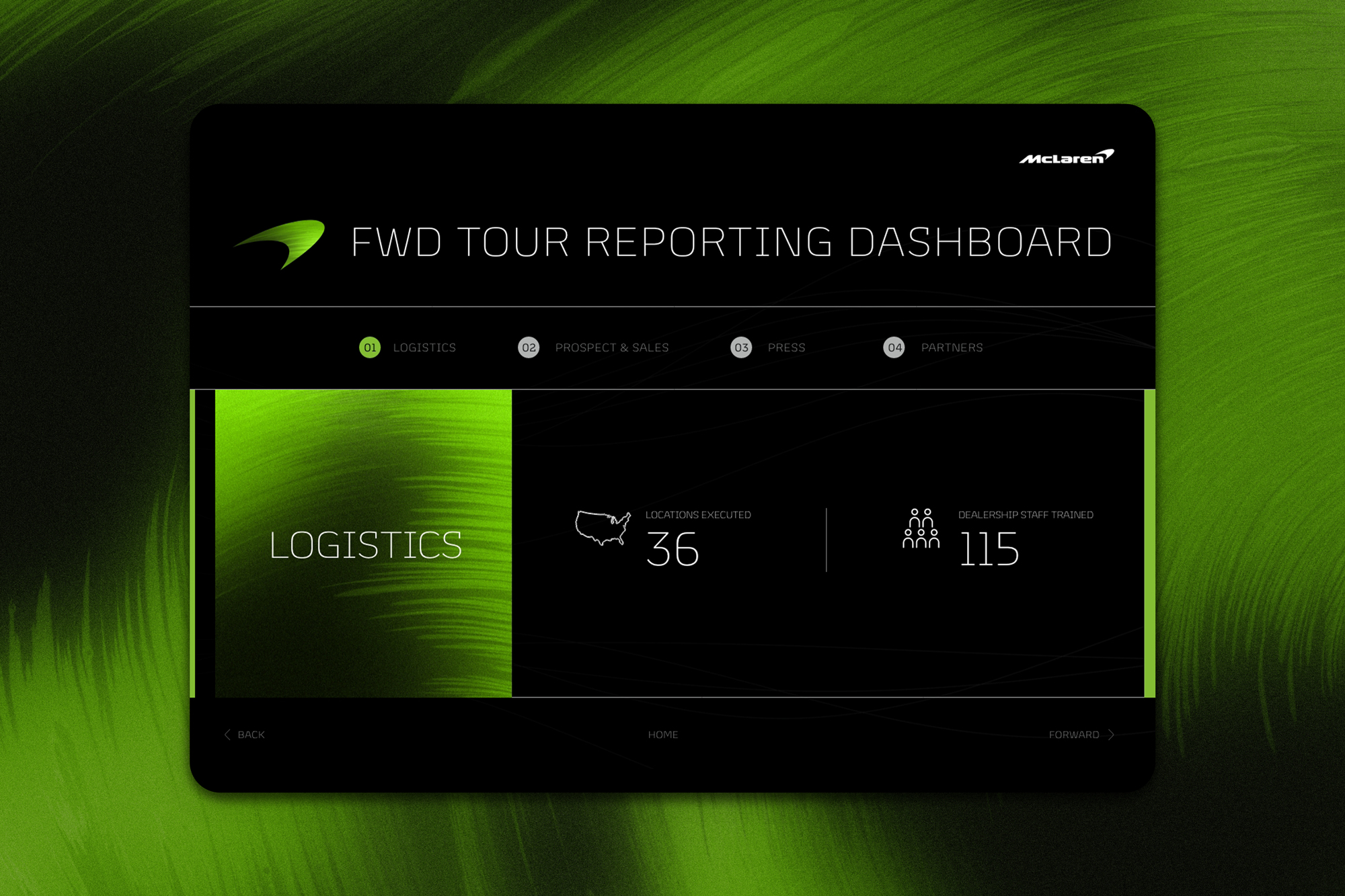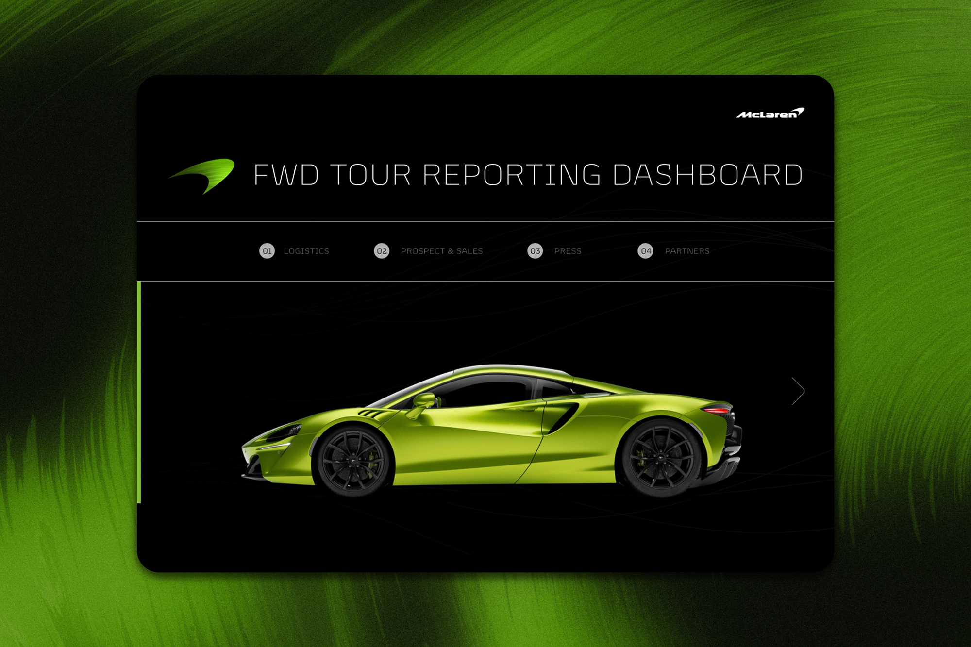 With the launch of the new McLaren Artura, FWD tour was developed to help push the vehicle to the public. My role as the lead designer was to create a reporting dashboard so that the cleint could easily view this event’s overall results. I worked with Plan B’s developer to design an Artura branded microsite that housed digestable sets of data. This design is meant to be easily scrollable while also pushing the client’s branding for the Artura.