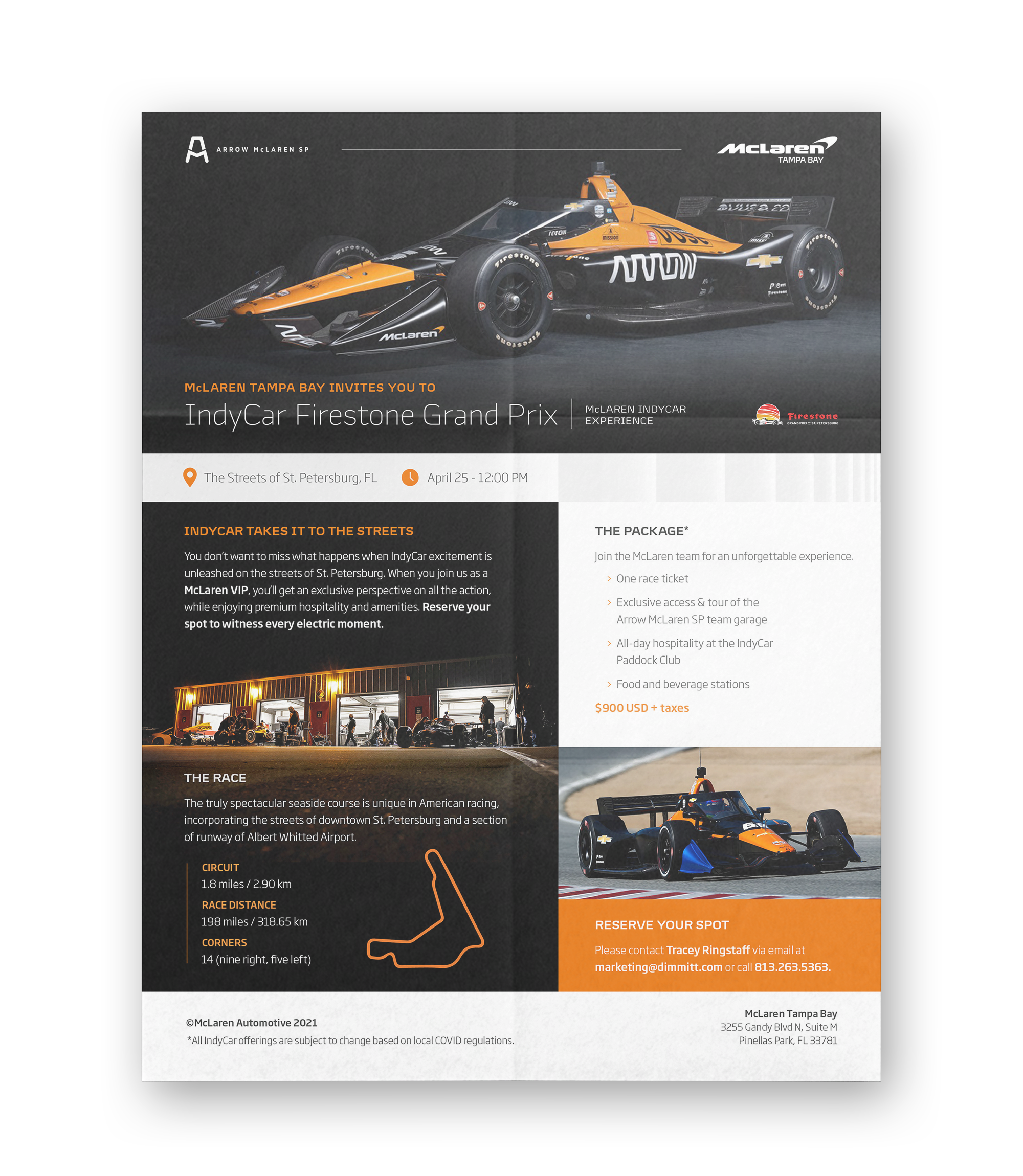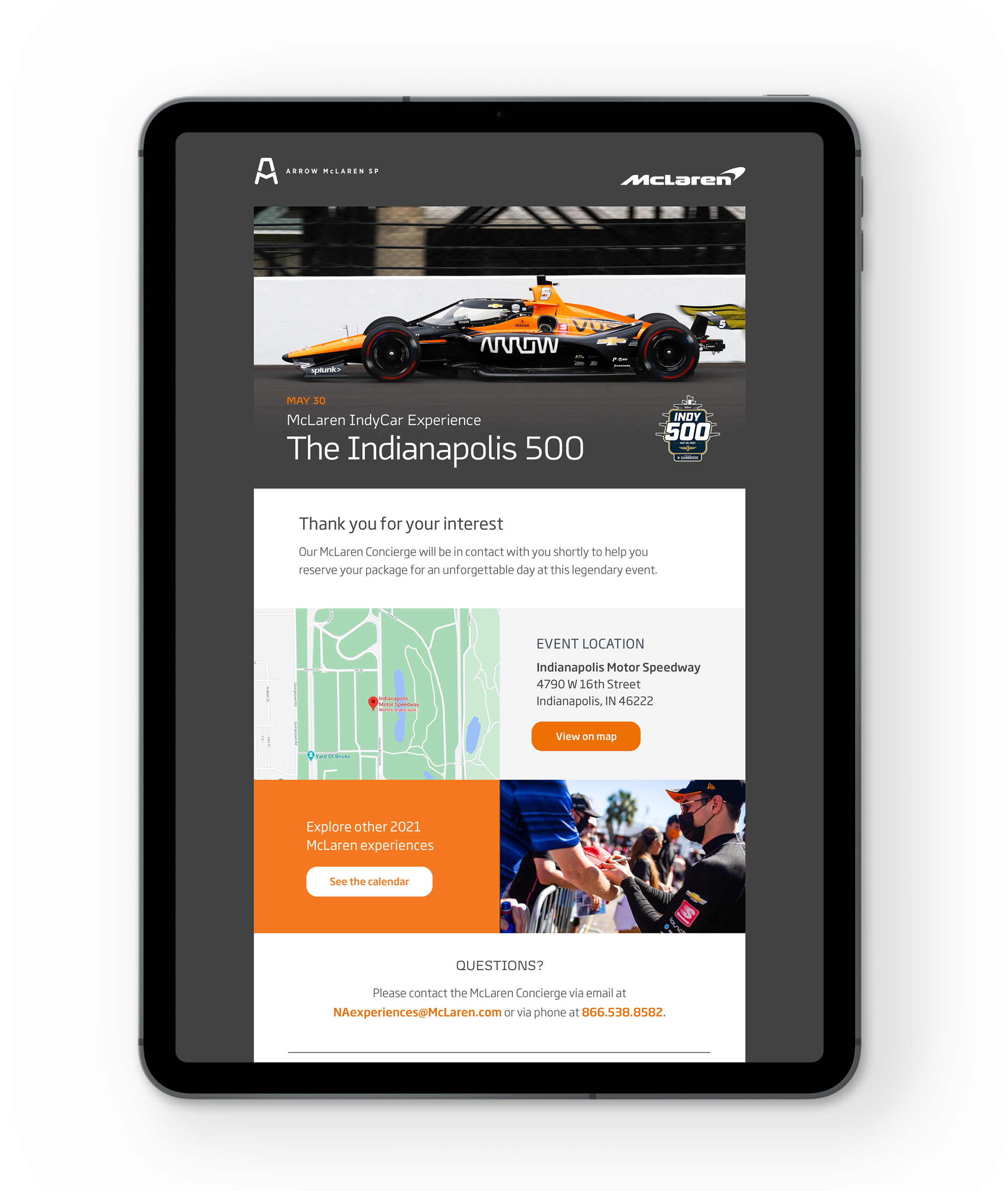 McLaren IndyCar is a racing experience that is lead by a team involving Arrow Electronics, McLaren Racing and Schmidt Peterson Motorsports. For this event and most other racing events, I designed the emails, social posts and registration landing page. For IndyCar, I also designed a PDF one sheet for North American dealers to send to VIP customers who might want to experience the different IndyCar races. All of these assets must function cohesively so that the user will recognize the brand and the specific event. Using McLaren’s branding, I created someclean, modular layouts that are responsive on mobile and easily readable.