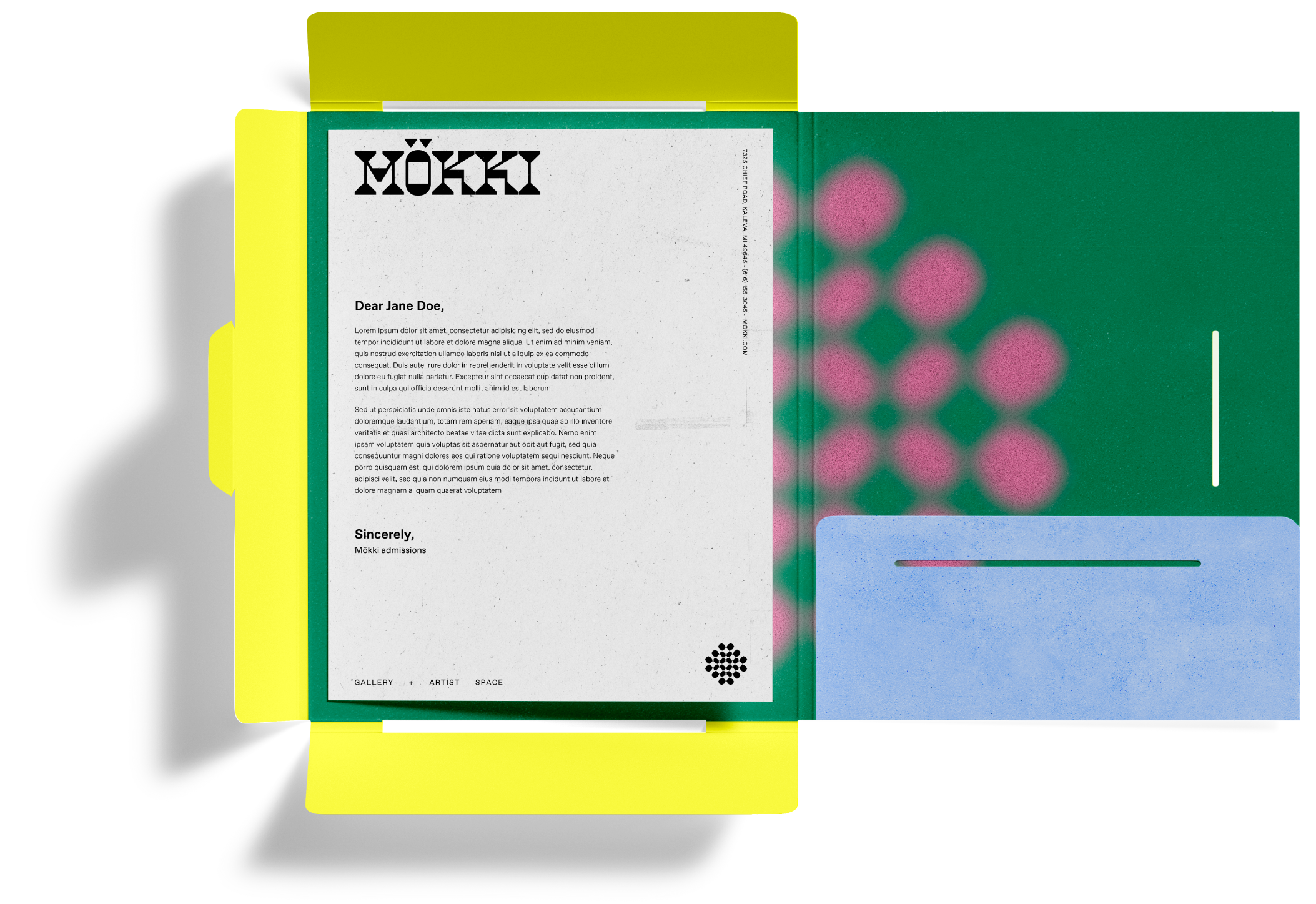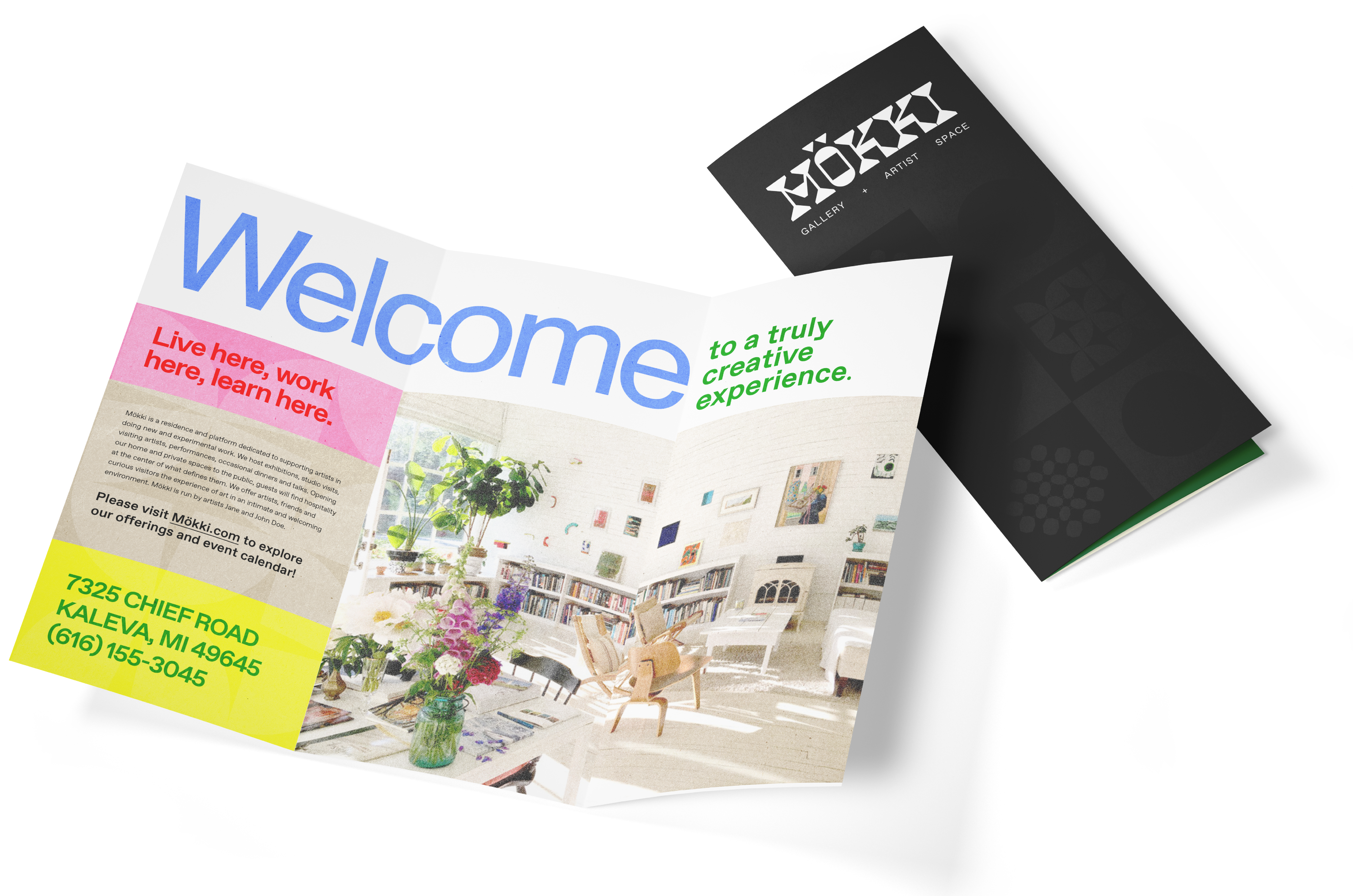 Mökki is a branding concept for an artist residency and gallery space in Michigan. Inspired by a real space for sale (found on Zillow), this project’s goal was to create a brand system and story that describes a playful and creative institution. The word “mokki” translates to “cottage” in Finnish and was chosen for both the property’s cozy feel and the community’s scandinavian history. The colors for this brand are vibrant, flexible and reflect a contemporary learning environment. The brand patterns and symbols are inspired by cottage-core quilt elements with a modern twist. Since the colors and symbols are flexible the typography remains crisp, clear and consistent.
